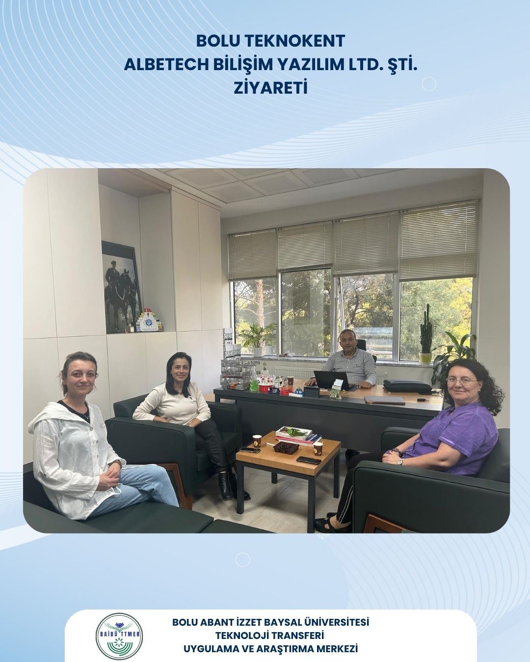 Üniversite-Sanayi işbirliği kapsamında, Bolu Teknokent'te yazılım faaliyetleri yapmakta olan ALBETECH Bilişim Yazılım Ltd. Şti.'ne ziyaret gerçekleştirildi. Ziyaret kapsamında firma sahibi Ayhan MİLLİ ve Çiğdem MİLLİ ile görüşüldü. Görüşmede talep ve öneriler ile yapılabilecek işbirlikleri ve ortak çalışmalar değerlendirildi.
