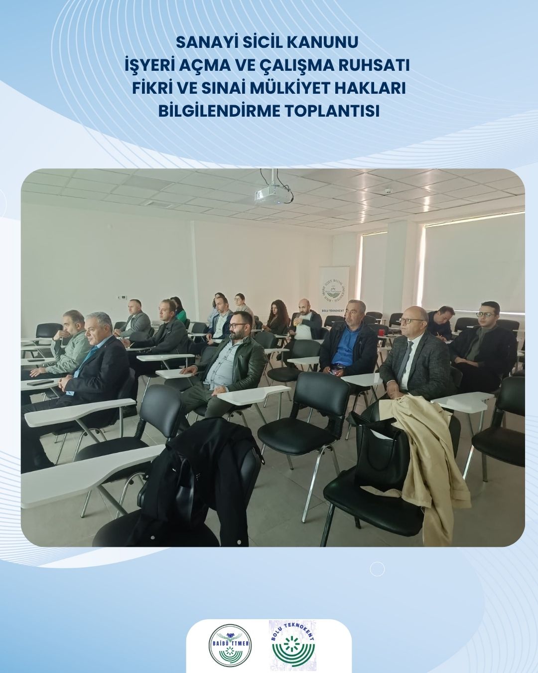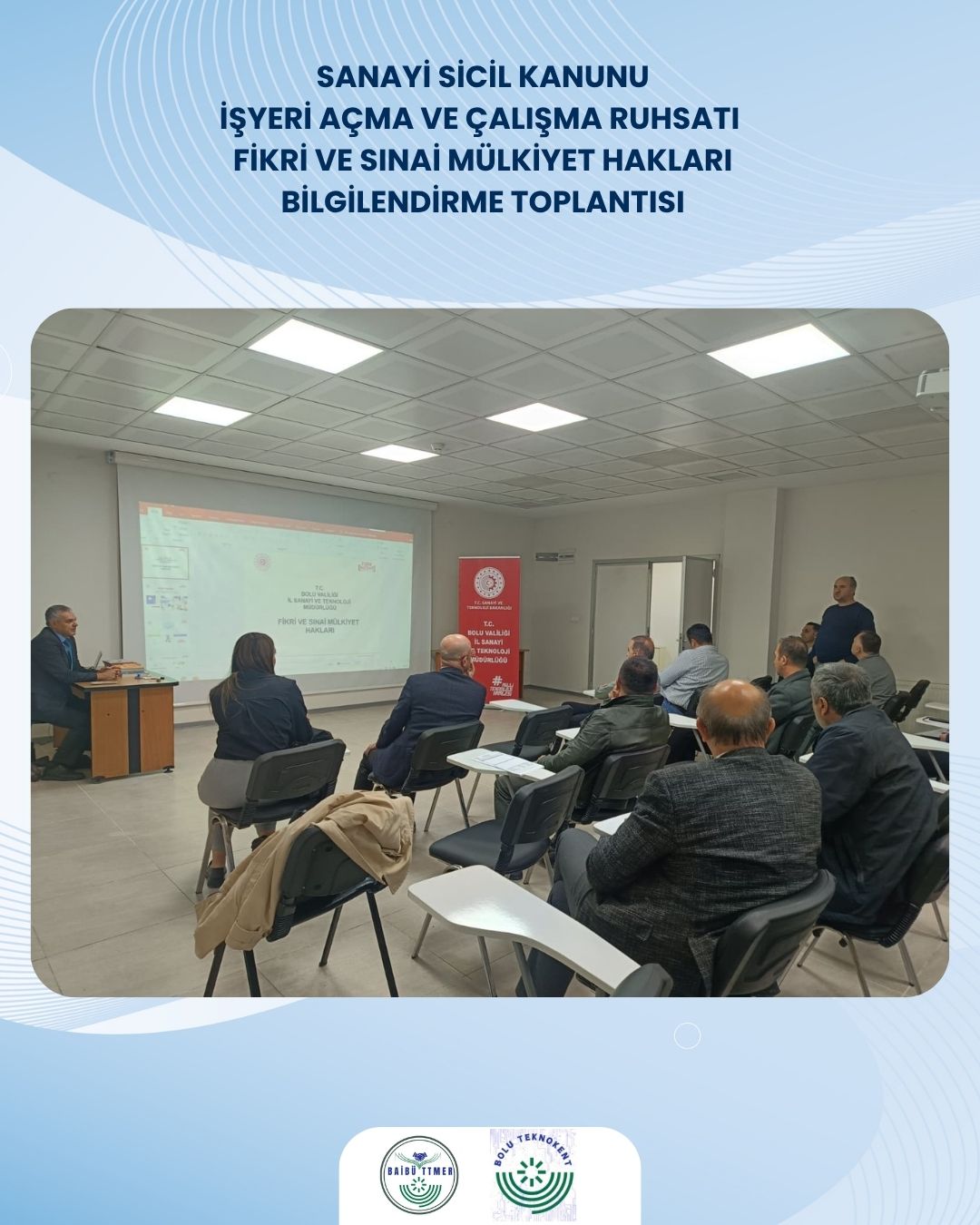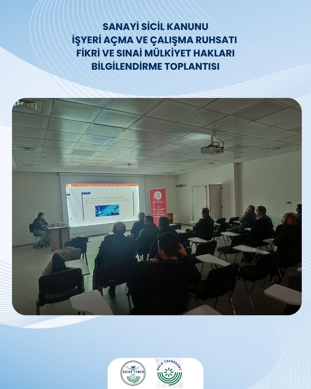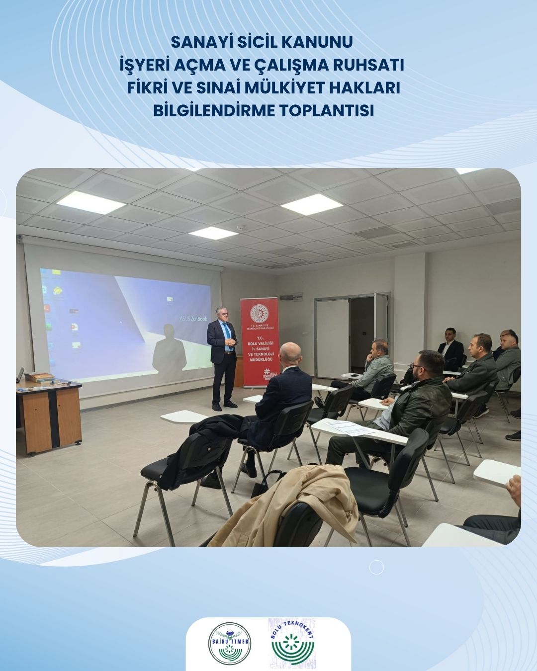Bolu Sanayi ve Teknoloji İl Müdürlüğü tarafından Bolu Teknoloji Geliştirme Bölgesinde faaliyet gösteren firmalara, “Sanayi Sicil Kanunu, İşyeri Açma ve Çalışma Ruhsatı, Fikri ve Sınai Mülkiyet Hakları” ile ilgili bilgilendirme toplantısı geçekleştirildi.