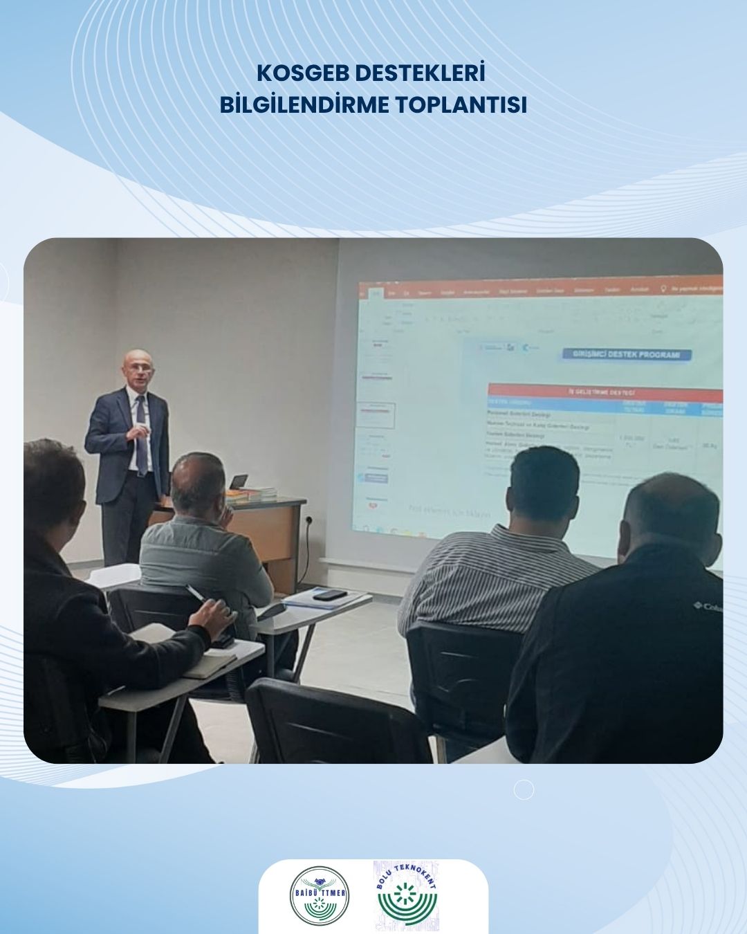 KOSGEB Bolu İl Müdürü tarafından Bolu Teknoloji Geliştirme Bölgesinde faaliyet gösteren firmalara KOSGEB Destekleri ile ilgili bilgilendirme toplantısı geçekleştirildi. Toplantıda KOSGEB Kapasite Geliştirme Destek Programı ve Girişimci Destek Programı İş Geliştirme Desteği ile ilgili ayrıntılı bilgilendirme yapıldı.