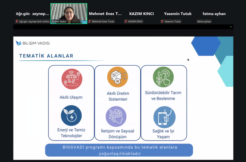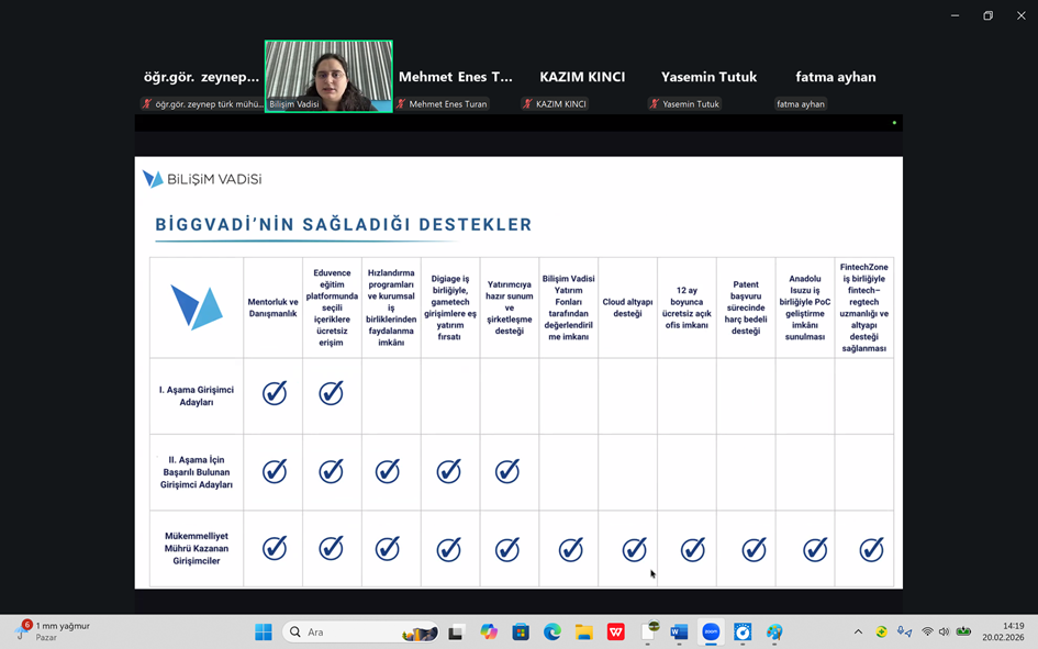 Çevrimiçi düzenlenen toplantıda, Bilişim Vadisi Ekosistem Geliştirme Uzmanı Beyza Nur Kork tarafından üniversitemiz akademisyen ve öğrencilerine yönelik TÜBİTAK BİGG Programı ve 2026-1 çağrı süreci ve sağlanan avantajlar hakkında bilgilendirme yapıldı.