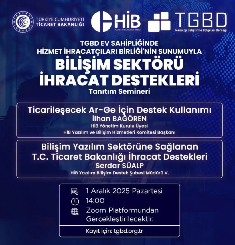 Türkiye’nin bilişim sektörünü uluslararası alanda güçlendirmeye yönelik çalışmaları keşfedeceğiniz bu etkinlikte; “Ticarileşecek Ar-Ge İçin Destek Kullanımı” ve "Bilişim Yazılım Sektörüne Sağlanan T.C. Ticaret Bakanlığı İhracat Destekleri" adlı sunumlar gerçekleştirilecek ve sorularınız cevaplandırılacaktır.