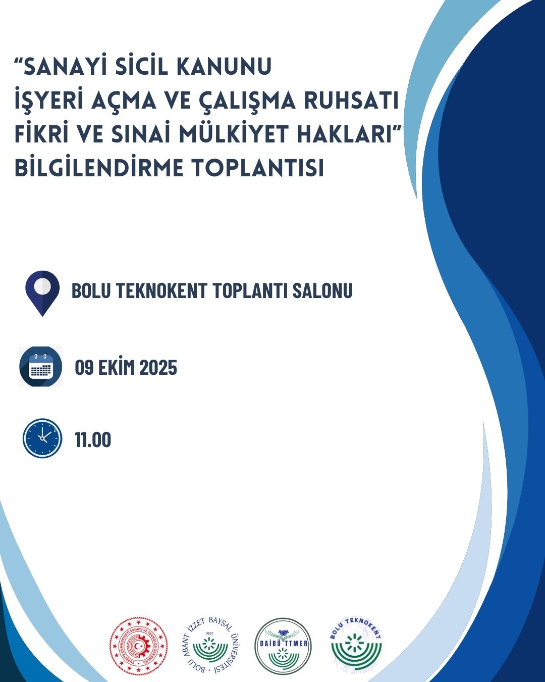 Bolu Sanayi ve Teknoloji İl Müdürlüğü tarafından “Sanayi Sicil Kanunu”, “İşyeri Açma ve Çalışma Ruhsatı”, “Fikri ve Sınai Mülkiyet Hakları” Bilgilendirme Toplantısı yapılacaktır.